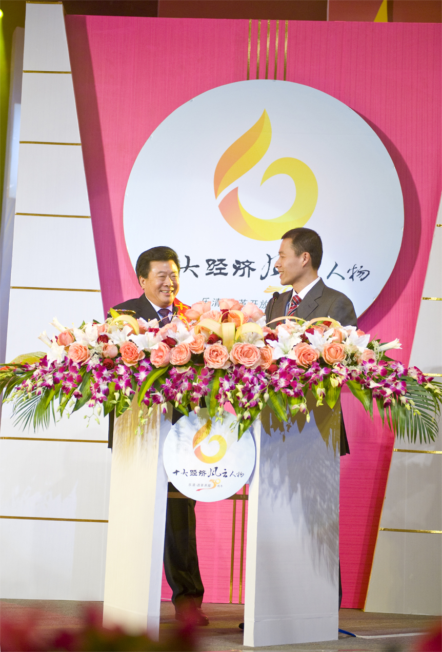 董事长施中旦荣获乐清市“十大经济风云人物”光荣桂冠,乐清市有关领导为施中旦先生颁发奖杯和证书。随后,施中旦又愉快地接受现场主持人采访,畅谈获奖感言。他说,只有个人、企业、社会和谐相处,才能共同发展;个人的成功离不开社会支持和帮助,自身要讲究诚信仁义、注重中庸和谐,要敢于担负责任、勇于勤奋创新。施董的话引起现场观众的囟仍奚秃腿攘一队。