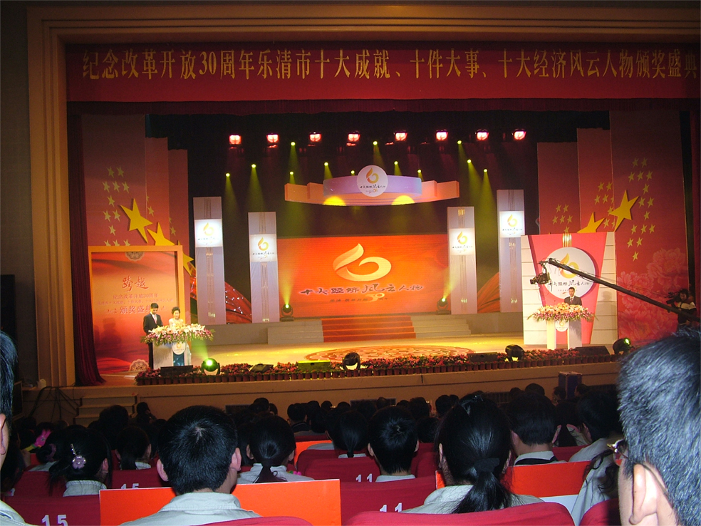 大型舞蹈剧《跨越》拉开激情盛典序幕,主持人宣布了历<三个月公众评选出的十大成就、十件大事及十大经济风云人物内容详单和获奖名单,乐清市委书记黄正强,市人大主任赵乐强,市长潘孝正等领导分别为“十大经济风云人物奖”及提名奖获得者共20人颁发奖杯和证书。市委书记黄正强在致辞中指出,此次评出的乐清市“十大成就”、“十<大事”和“十大经济风云人物”,从不同角度深刻展示了乐清市改革开放30年以来的伟大成就和光辉历程。